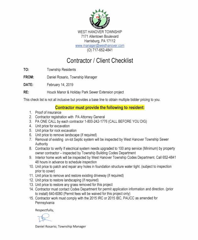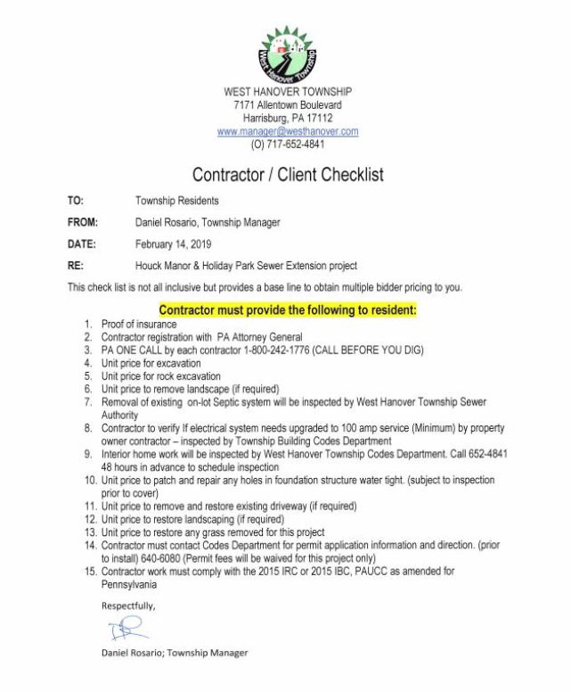 Houck Manor sewer installations are proceeding well! Many residents have connected and are now using their new pumping systems. If you have not yet done so, please stop in at the Township Office and pickup your building and electricals permits before picking up your sewer permit! If you have any questions, feel free to contact us and we will do our best to assist! We can be reached by phone at 717.540.0124.